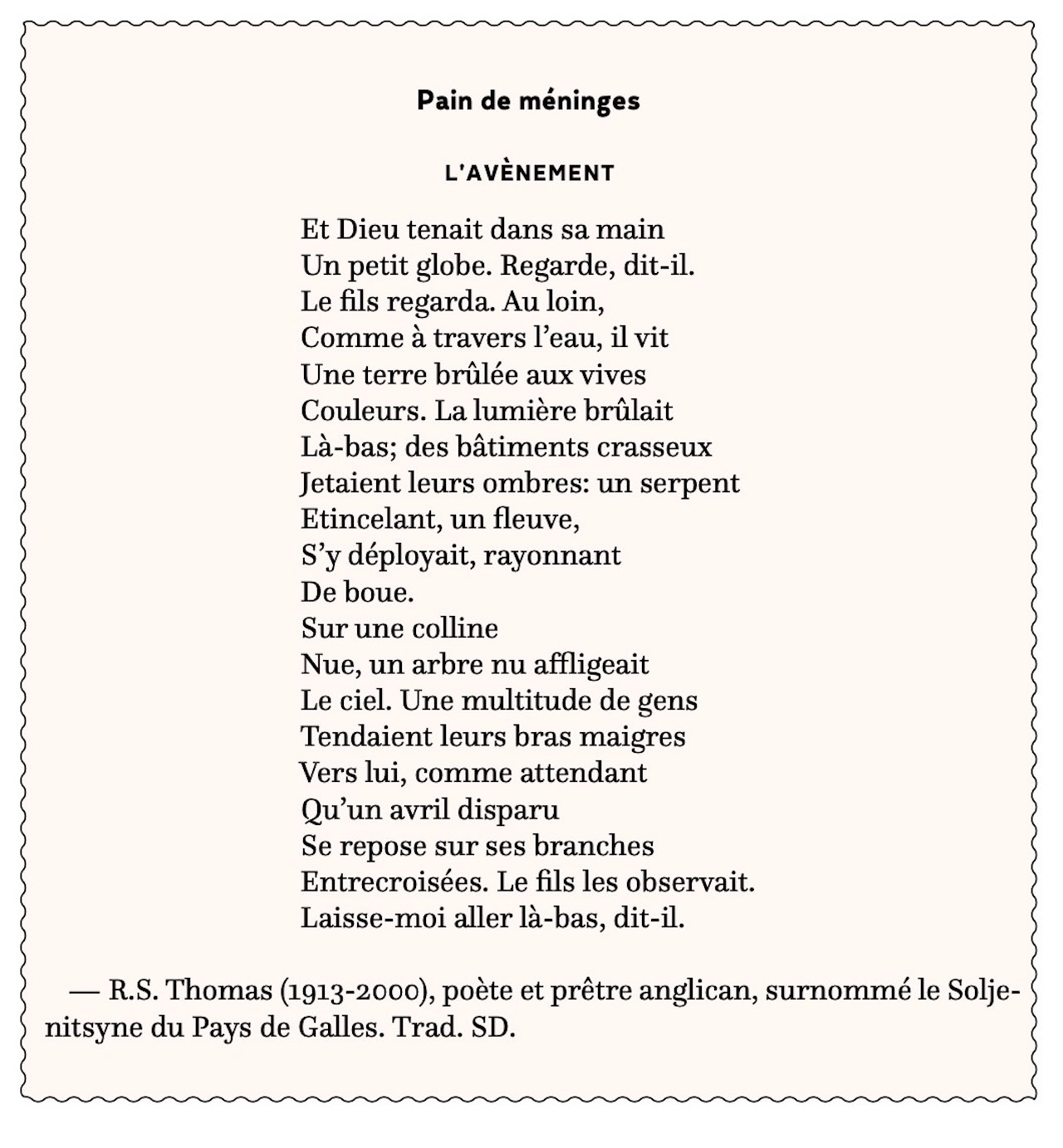 — R.S. Thomas (1913-2000), poète et prêtre anglican, surnommé le Soljenitsyne du Pays de Galles. Trad. SD.