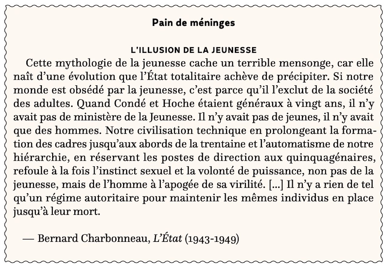 Cette mythologie de la jeunesse cache un terrible mensonge, car elle naît d’une évolution que l’État totalitaire achève de précipiter. Si notre monde est obsédé par la jeunesse, c’est parce qu’il l’exclut de la société des adultes. Quand Condé et Hoche étaient généraux à vingt ans, il n’y avait pas de ministère de la Jeunesse. Il n’y avait pas de jeunes, il n’y avait que des hommes. Notre civilisation technique en prolongeant la formation des cadres jusqu’aux abords de la trentaine et l’automatisme de notre hiérarchie, en réservant les postes de direction aux quinquagénaires, refoule à la fois l’instinct sexuel et la volonté de puissance, non pas de la jeunesse, mais de l’homme à l’apogée de sa virilité. […] Il n’y a rien de tel qu’un régime autoritaire pour maintenir les mêmes individus en place jusqu’à leur mort.