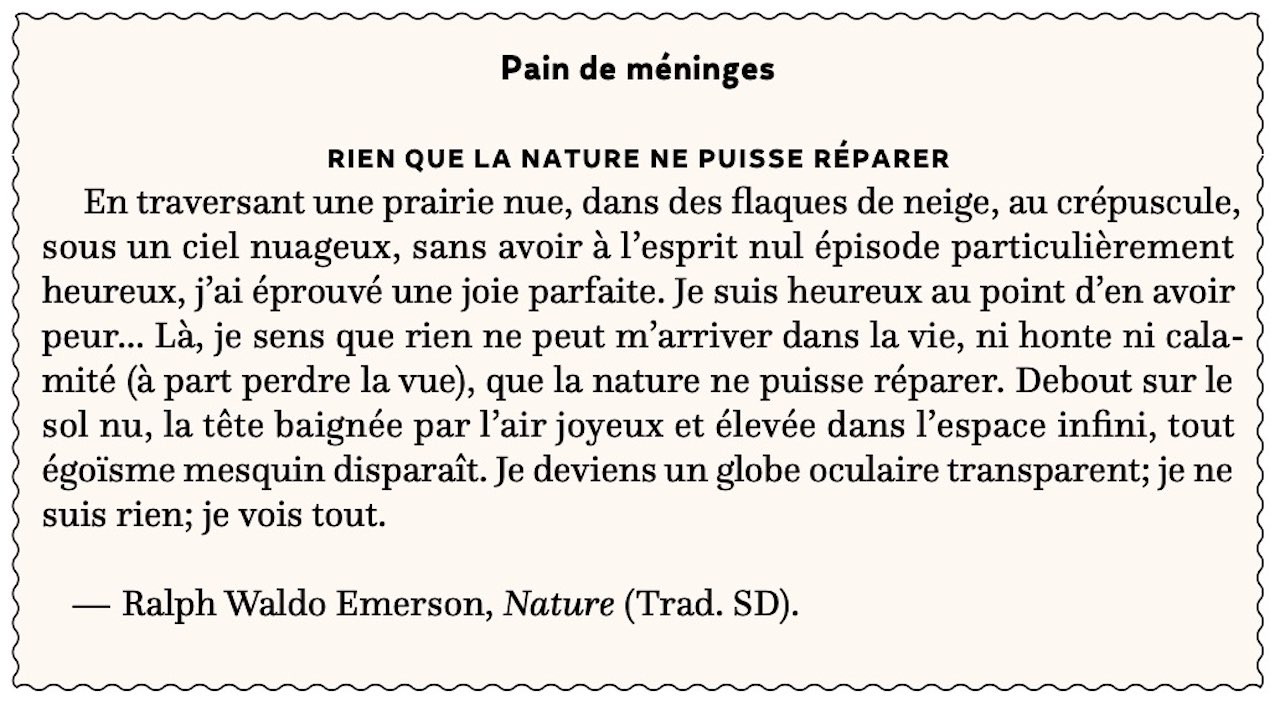 En traversant une prairie nue, dans des flaques de neige, au crépuscule, sous un ciel nuageux, sans avoir à l’esprit nul épisode particulièrement heureux, j’ai éprouvé une joie parfaite. Je suis heureux au point d’en avoir peur… Là, je sens que rien ne peut m’arriver dans la vie, ni honte ni calamité (à part perdre la vue), que la nature ne puisse réparer. Debout sur le sol nu, la tête baignée par l’air joyeux et élevée dans l’espace infini, tout égoïsme mesquin disparaît. Je deviens un globe oculaire transparent; je ne suis rien; je vois tout.